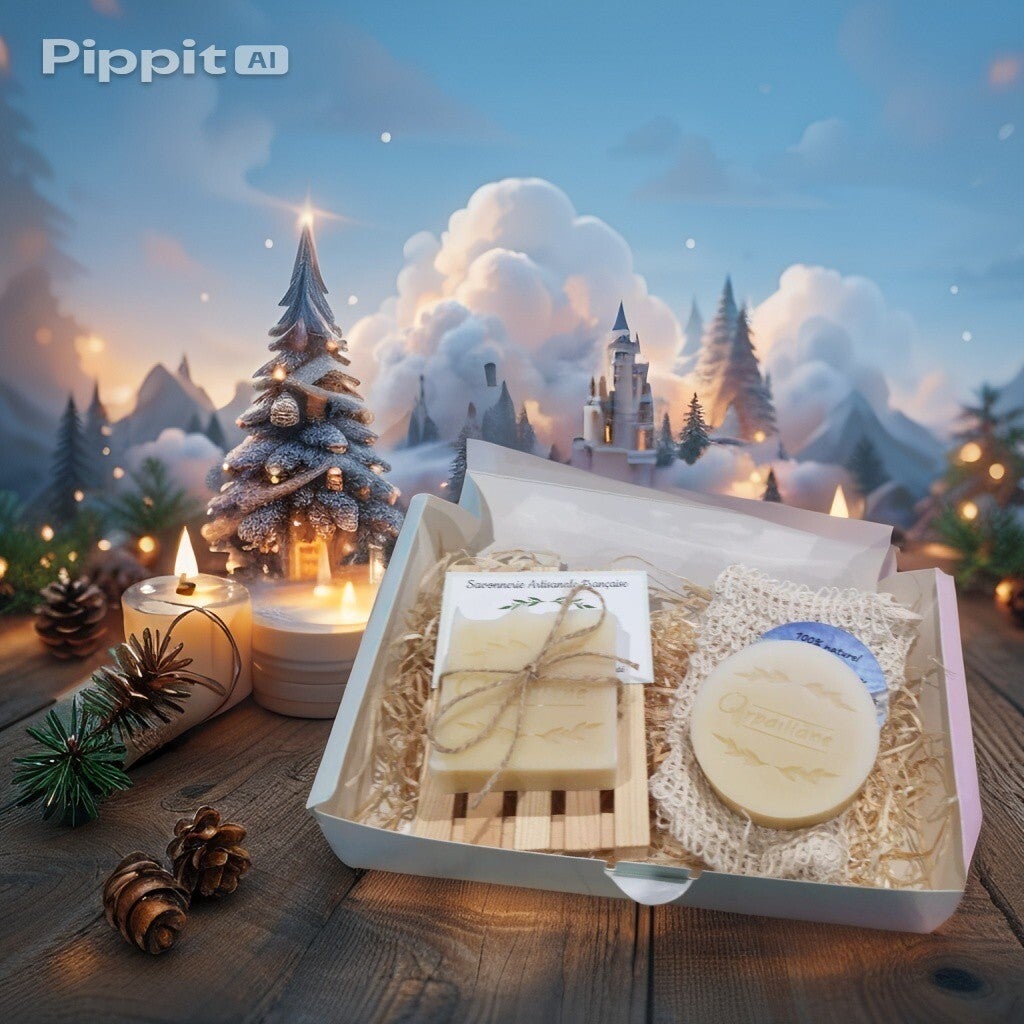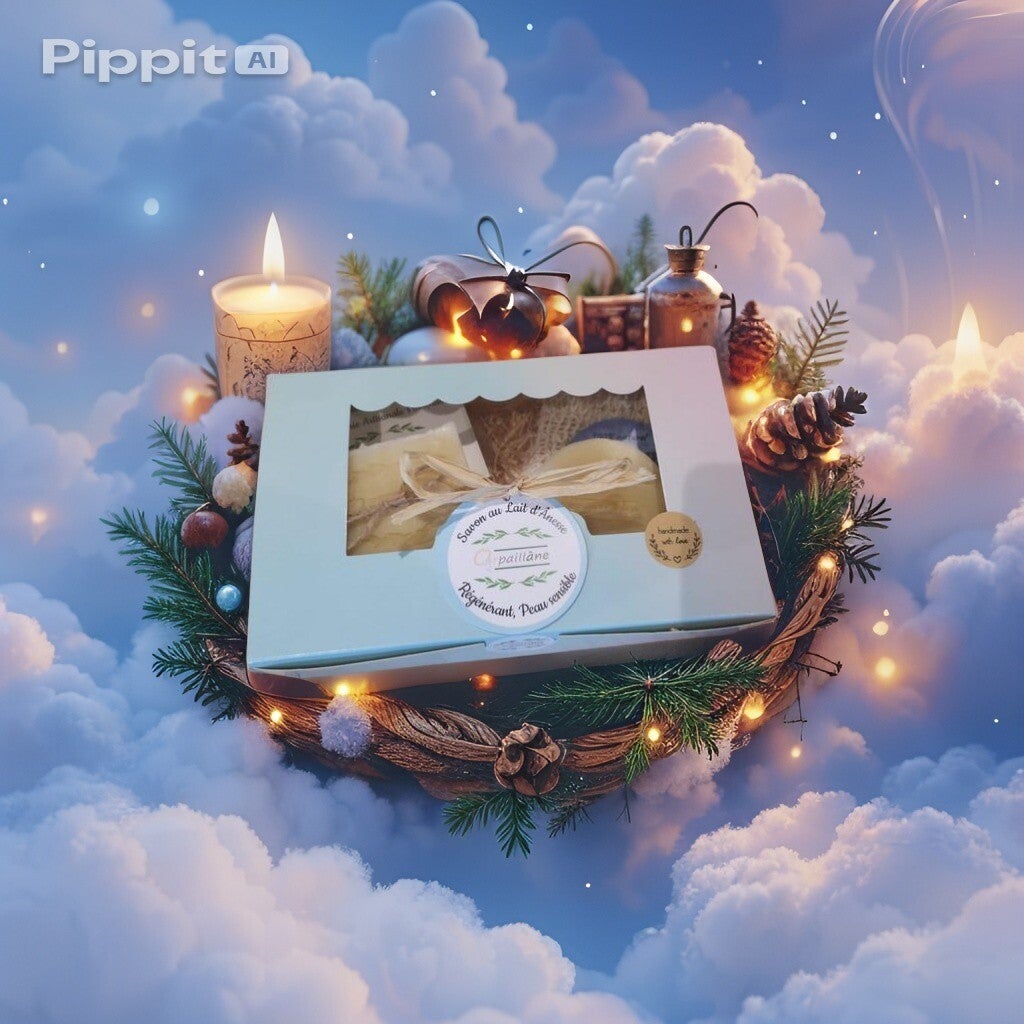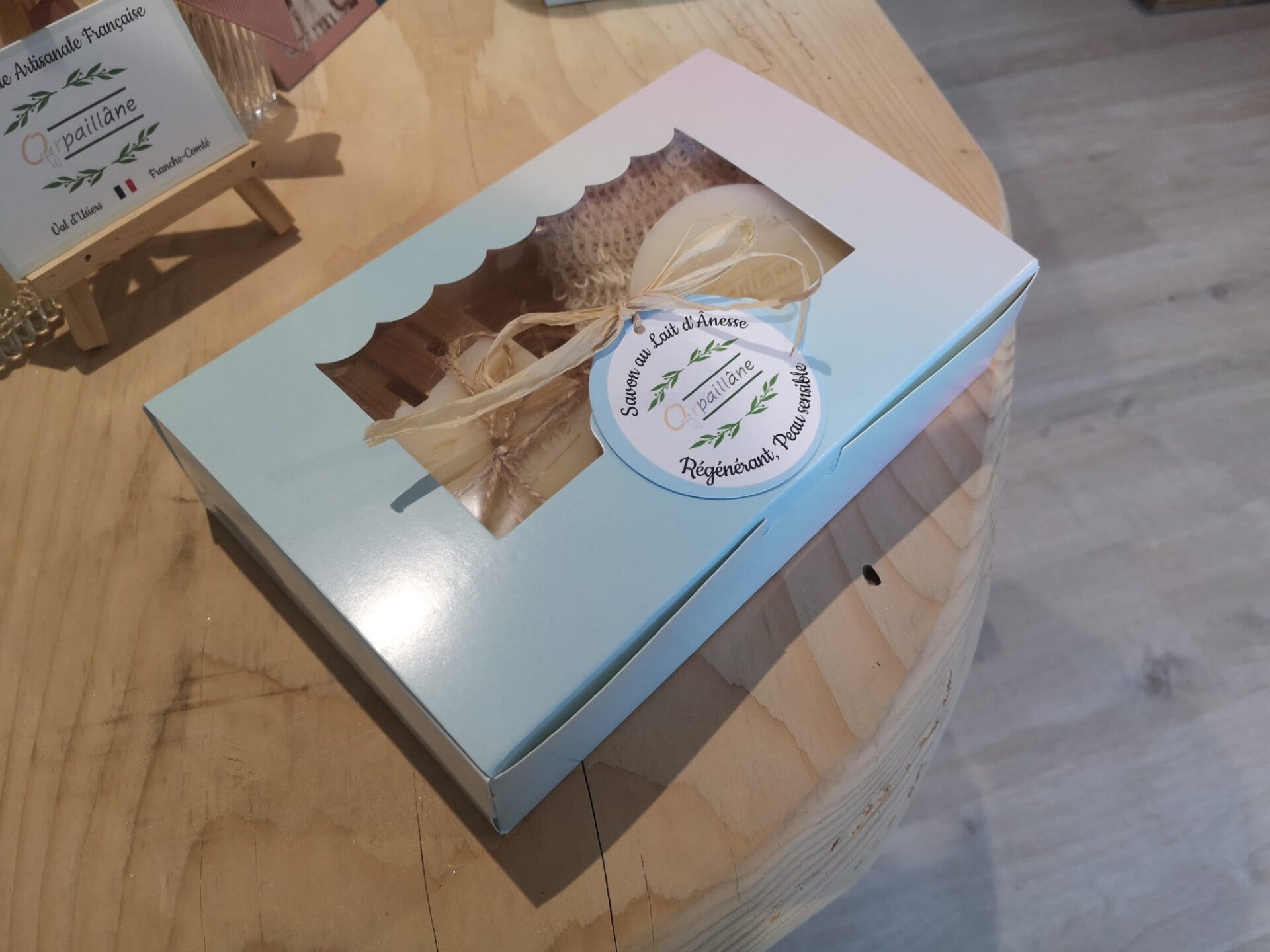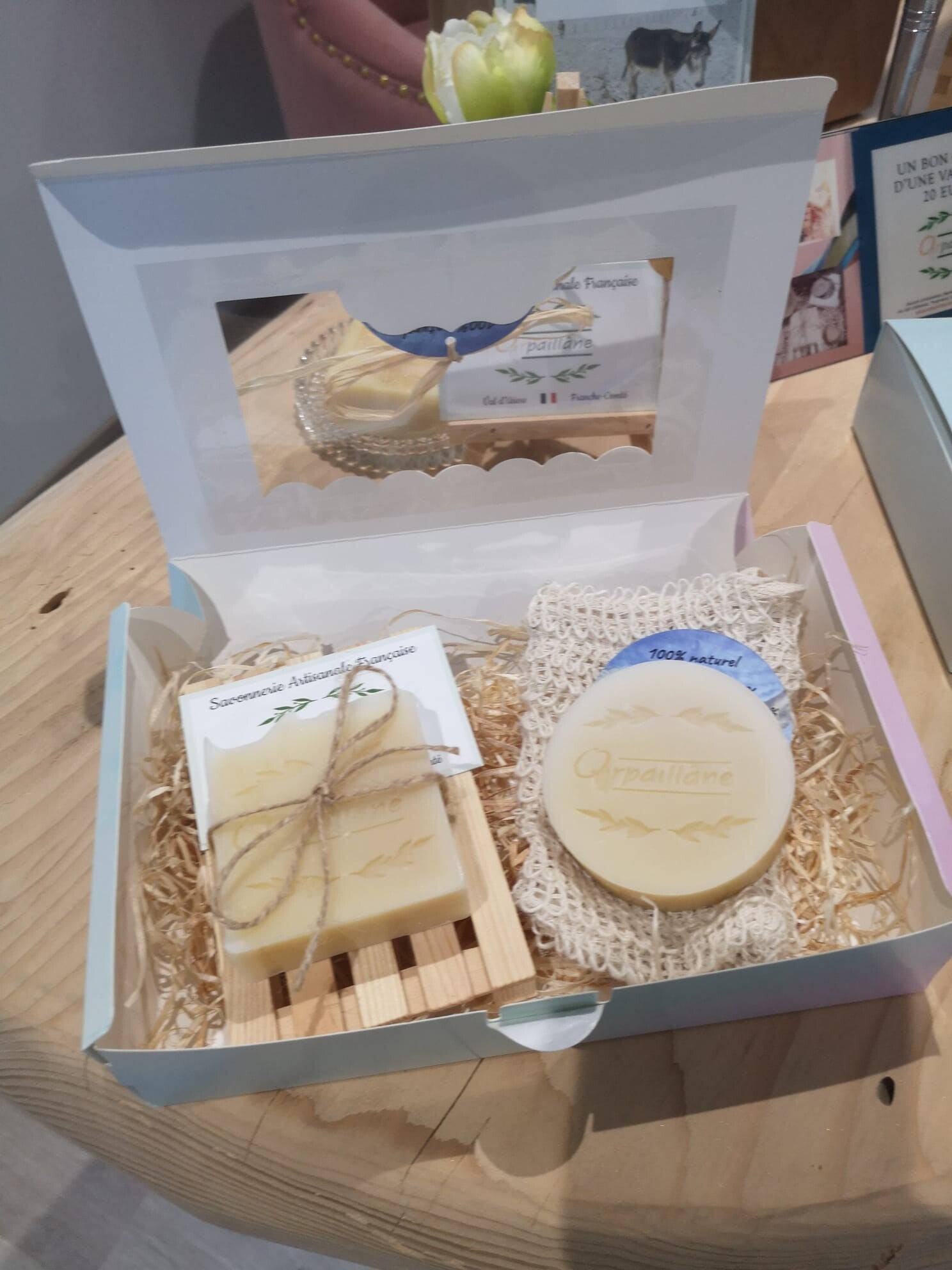 Coffret avec un savon carré au lait d'ânesse d'environ 80 grammes sur son porte savon et un savon de 100 grammes environ sur son gant gommant.